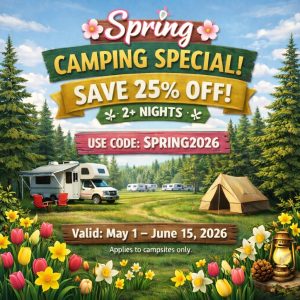 Spring Camping Special is Here! Kick off the camping season with fresh air, blooming trees, and a great deal! Stay 2 nights or more and SAVE 25%Valid: May 1 – June 14, 2026Location: Stayner Camp Use code SPRING2026 when booking your campsite and enjoy a