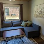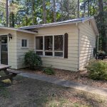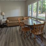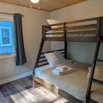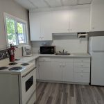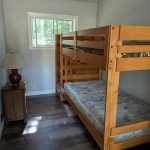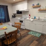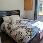 2 bedrooms, 1 bath, with kitchen. First bedroom has a Queen bed, second bedroom has twin bunk beds. Full washroom with bathtub, plus a living space with couch, kitchen table and chairs. Kitchen equipped with small stove, and microwave, coffee maker, toaster. Outdoor patio with BBQ and picnic table seating.