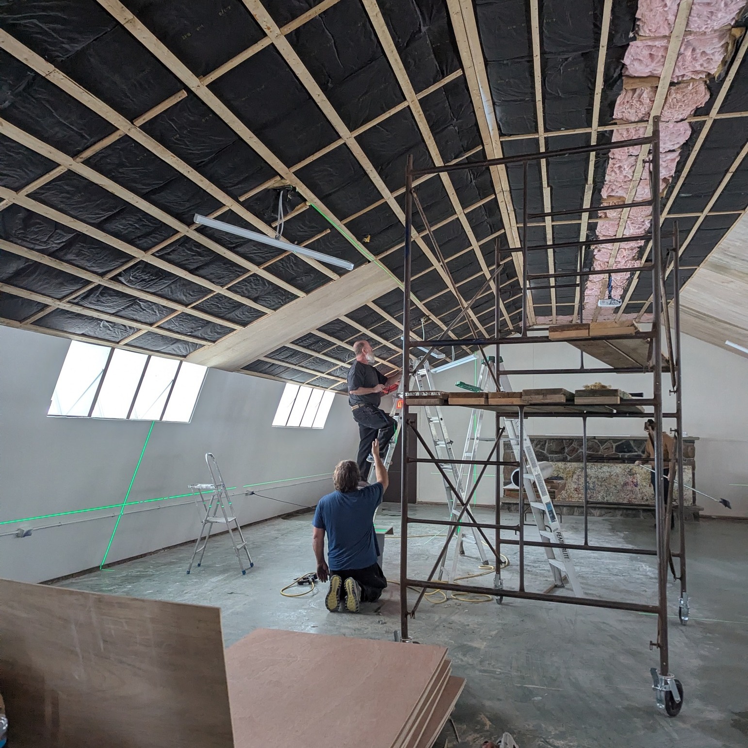 After yesterday's very cold day, it's nice to have a little fun outside. Ceiling panels are being installed in the Fellowship Hall, along with new lighting fixtures - and we are starting to scrub away…