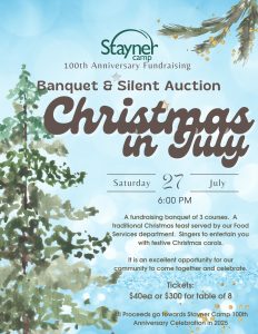 Join us for our Fundraising Christmas in July Banquet & Silent Auction on July 27th at 6pm. This will be a night filled with laughter, song, and delicious food. Feast from a 3-course buffet Turkey dinner with all the trimmings – and of course your favorite Christmas desserts as well.